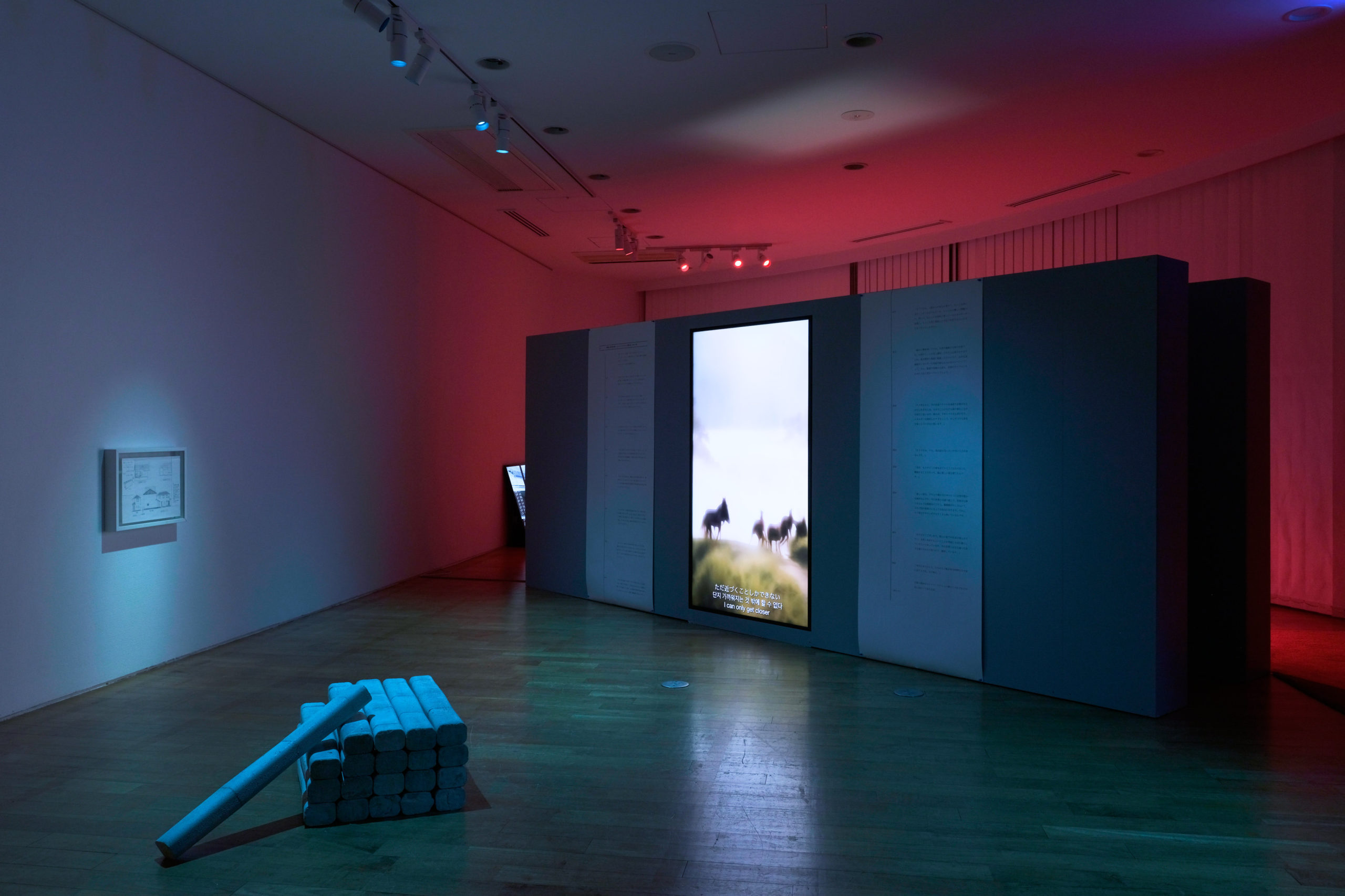今年度の出品作品はとりわけバリエーション豊かで、それぞれに高いクオリティを備えていて、難しい審査でした。優秀賞を誰にするべきか、さまざまな可能性を検討する中で、平岡さんの作品が優秀賞に選ばれました。平岡さんの作品は、インスタレーションを空間の中でどのように成立させるかを粘り強く考え、さまざまな試行錯誤を重ねたものだったと思います。作品審査の時点では、実家と隣家との境界に実在する低いブロック塀を模した展示でしたが、今回はそれを互いに見渡せない高さと奥行きに拡張し、より立体的で物質性の強い形へと展開していました。家紋入りの座布団やエプロン、パフォーマンスを記録した映像、母親同士の会話を創造的に展開したテキストなど、複雑な要素が組み合わされています。直接その生活を窺い知ることはできなくとも、常にその存在を感じながら生活している「隣人」というモチーフは、都市や国家、民族や文化圏といったレベルにも拡張可能な普遍性を持つテーマだと感じました。一方で、今回の展示ではDMZについても言及していましたが、そこはやや論点がぼやけてしまう印象を受けました。作品の本質か何であるのかを見極めることで過剰な要素は削ぎ落とし、より強度のある表現へと深化していくことを期待しています。(木村)