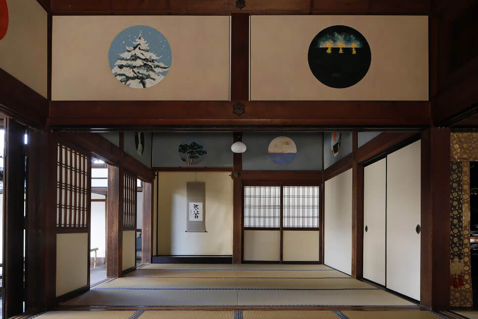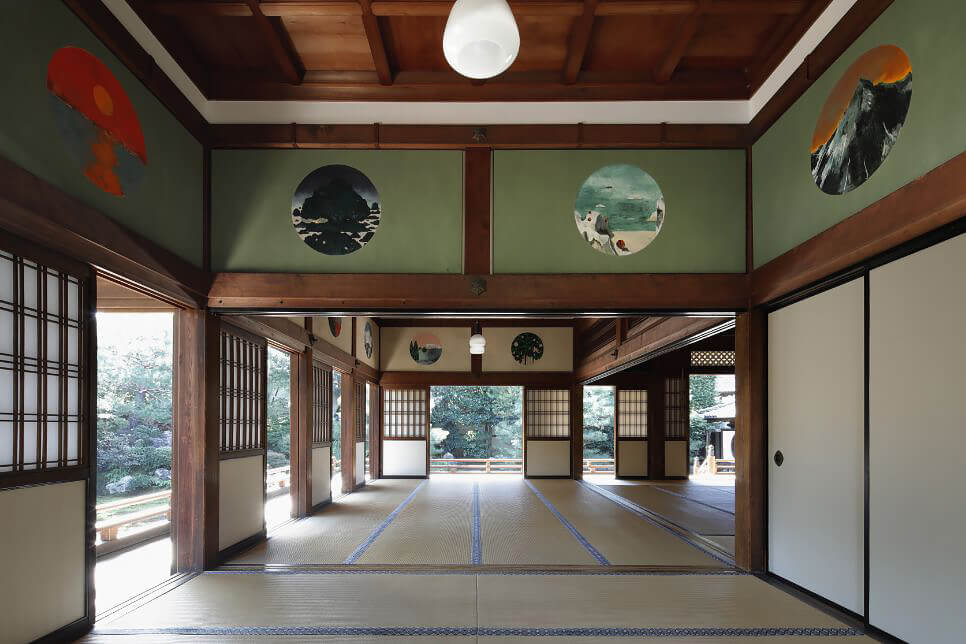 本展では、寺院建築に合わせた絵画シリーズが展示されます。各作品には、架空の世界へと続く円窓が描かれています。展覧会タイトル「Bird Time」は、朝陽が昇り、鳥たちがさえずり始める時間のことを指し、それは同時に、人々が寝醒め、1日の最初に目を開く時でもあります。
