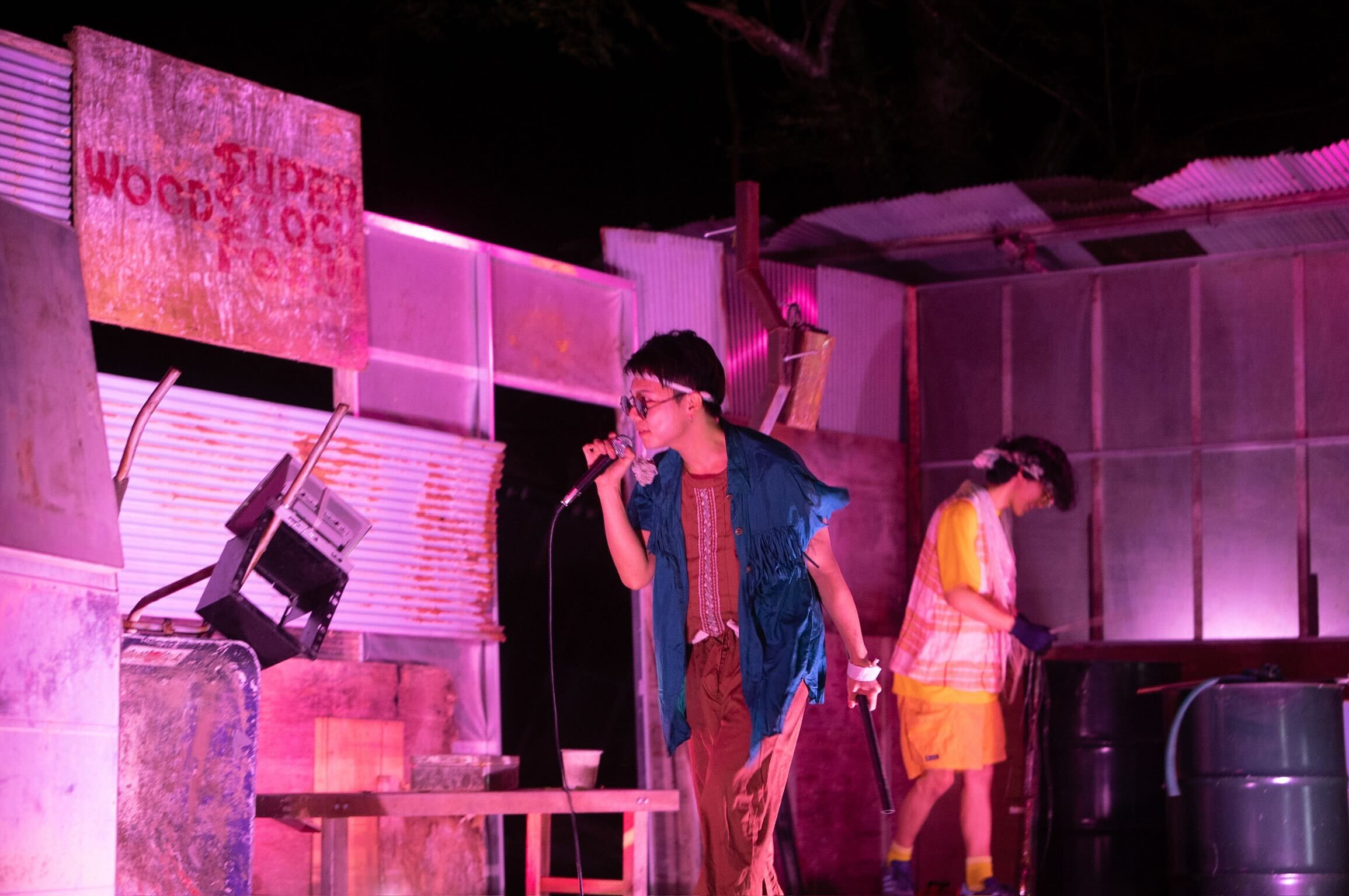 京都滞在制作時に、⼭中 suplexにあった廃材などを利⽤して制作したステージと楽器で約 20 分間のライブを⾏います。「⾳楽経験なしのModern Angels は果たして⾳を奏でることができるのか」という名⽬で、実験⾳楽を試みます。アメリカの⾳楽史に残る、「Woodstock Music and Art Festival」を模倣し、LIVE(⽣きる・⽣活)のためにおこなうライブ。早坂が作詞・AI が作曲を⾏い、現代的なテクノロジーも併⽤。 「きみも表現者」というコンセプトのもと、ライブをデジタルで消費している現代に⽣の場を体現します。